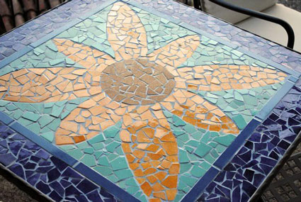 Adding a mosaic of ceramic tiles to your table top is another fantastic way to enhance an old piece of furniture. There are tile kits that you can buy or, if you are feeling ambitious, take some old dishes or other colorful ceramics that you no longer have a use for, break them up, and recycle them into your refurbished table top design!