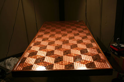 Using Pennies for a refurbished table top is a similar process to using bottle caps. Although pennies are uniform for the most part, they still have enough differences in them to create fun and interesting design patterns. This is most easily done by using a mix of older circulated coins and pennies that are fresh from the mint.
