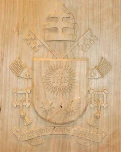 Their altar features three arches that mimic existing elements in the Basilica and represent the Holy Trinity, as well as four columns signifying the four vows taken by Jesuits. The papal chair features one simple high arch intended to keep the focus on Pope Francis and contains a hand-carved rendering of Poe Francis' papal coat of arms. The ambo, which is the lectern, is also simple and contains complementary design features.